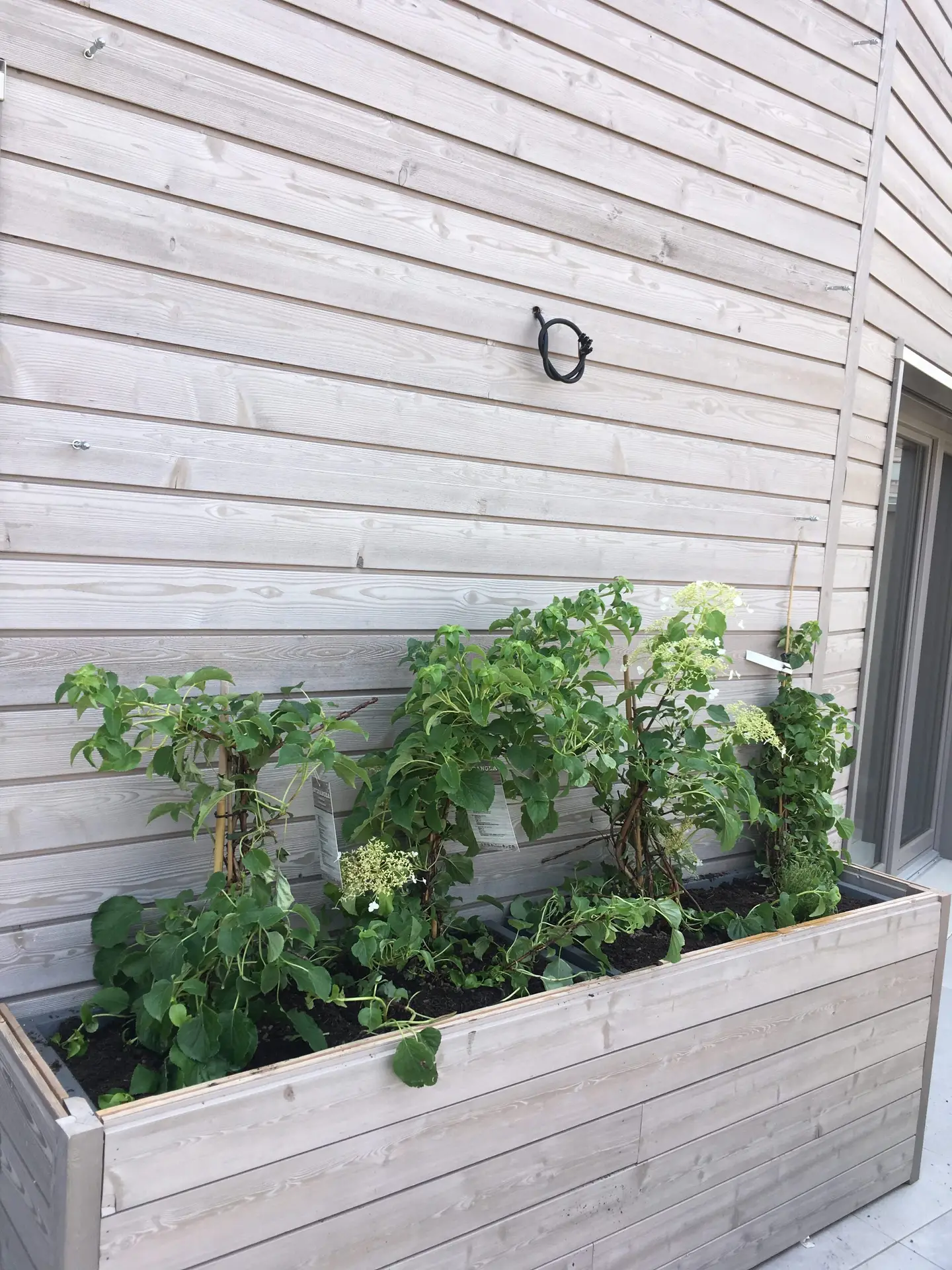 Enfin, pour entretenir et planter sur une terrasse, un support mural a été mis en place pour guider la croissance future des hortensias grimpants et du chèvrefeuille contre le mur.
